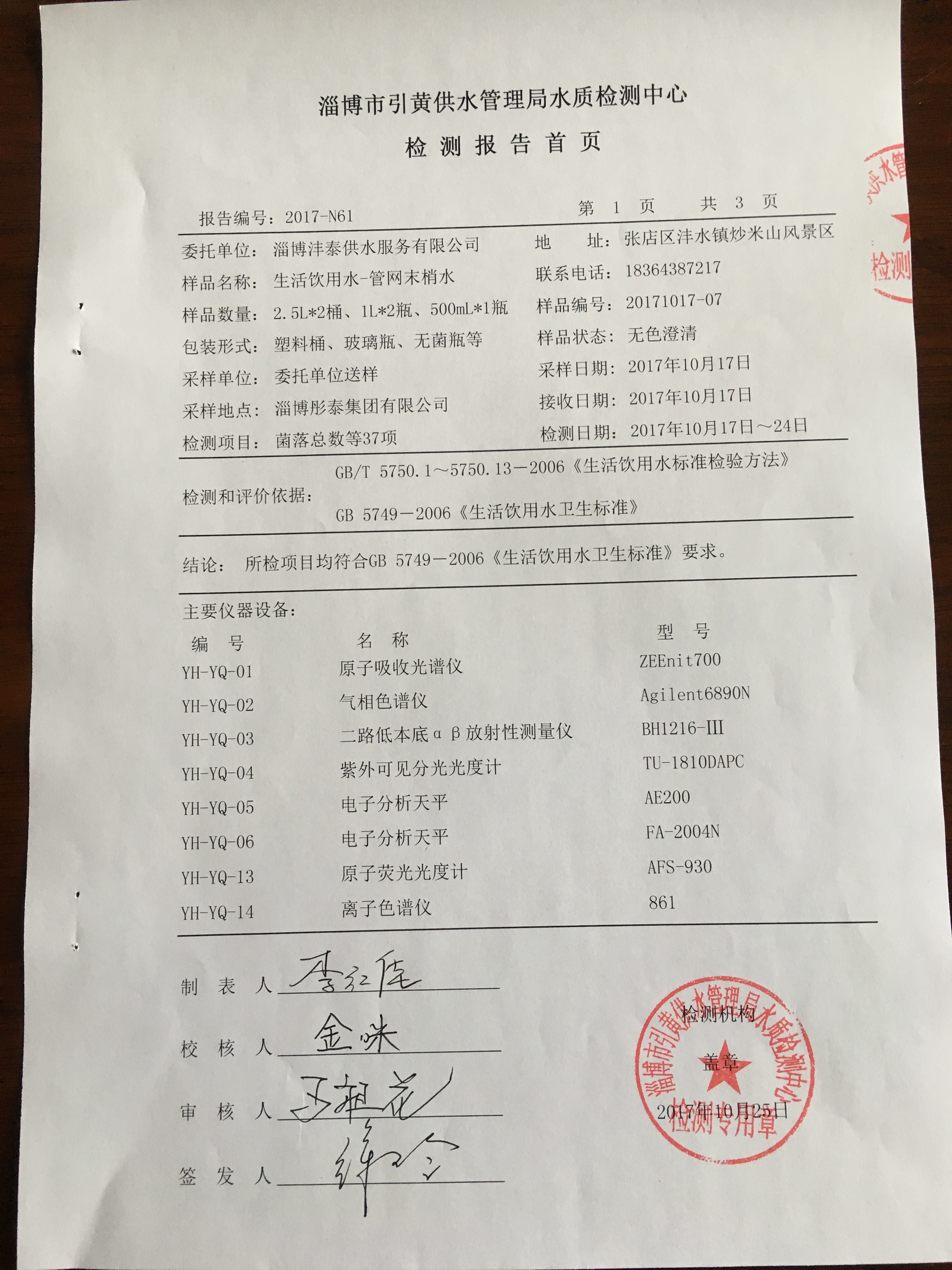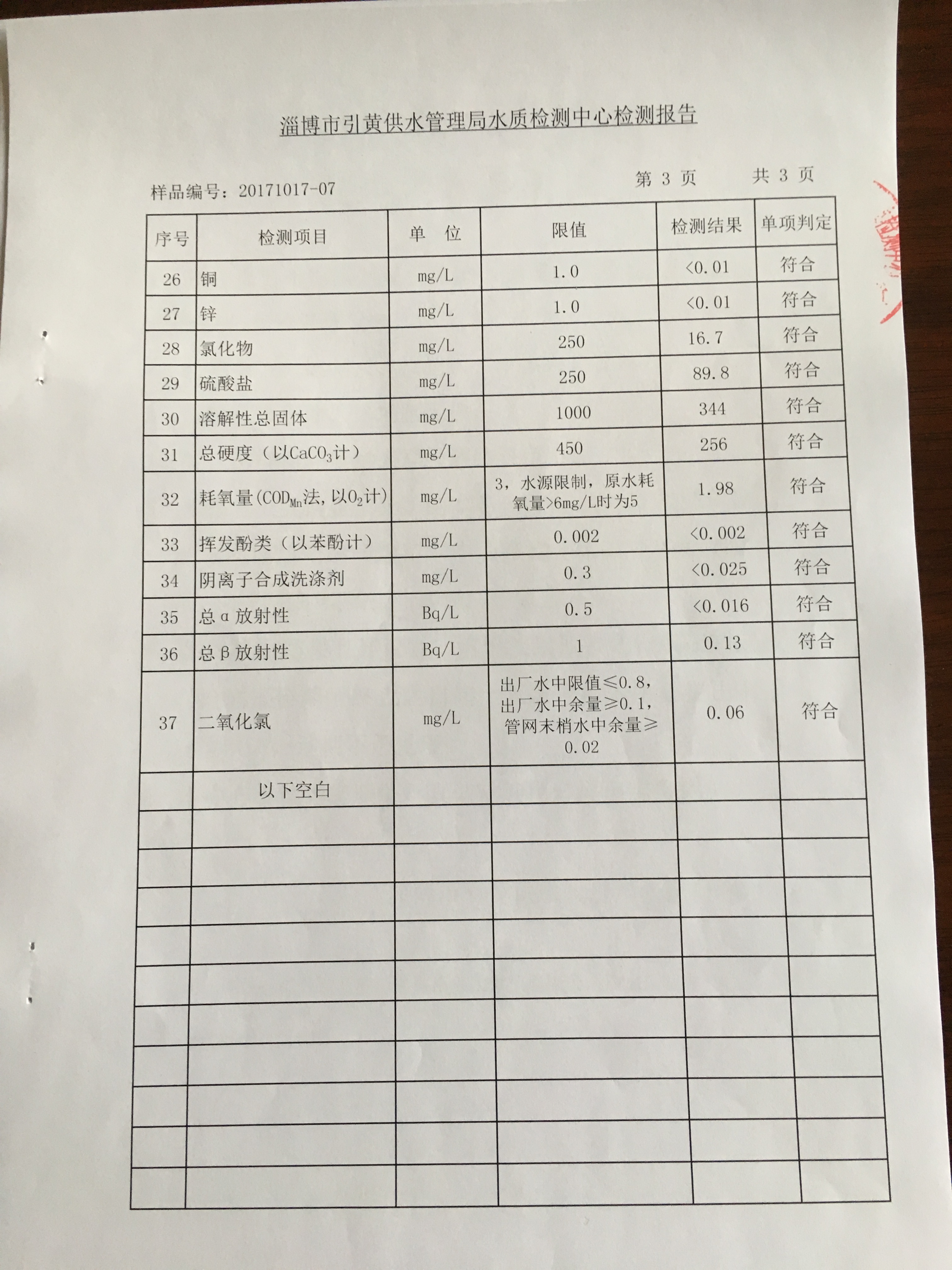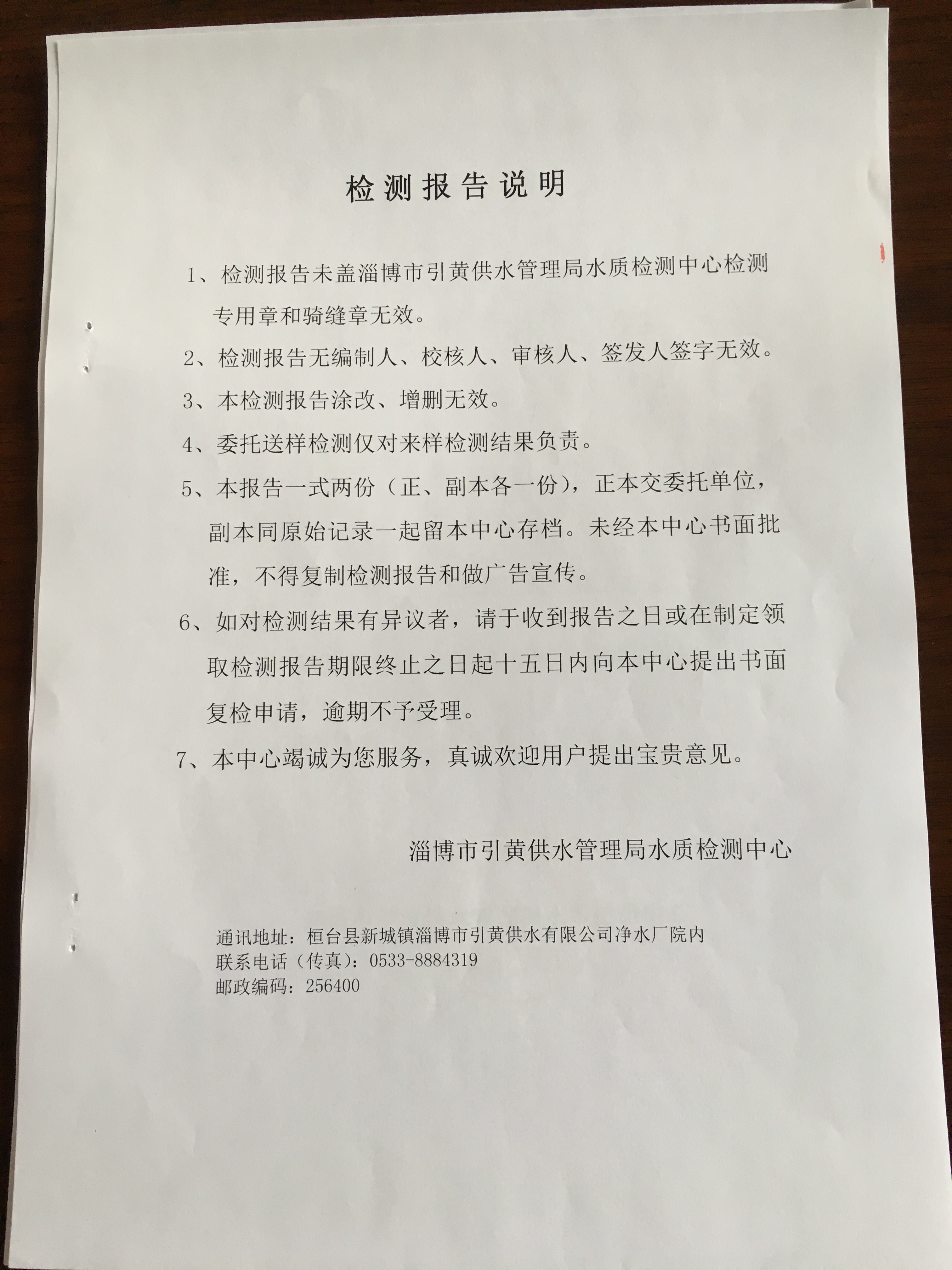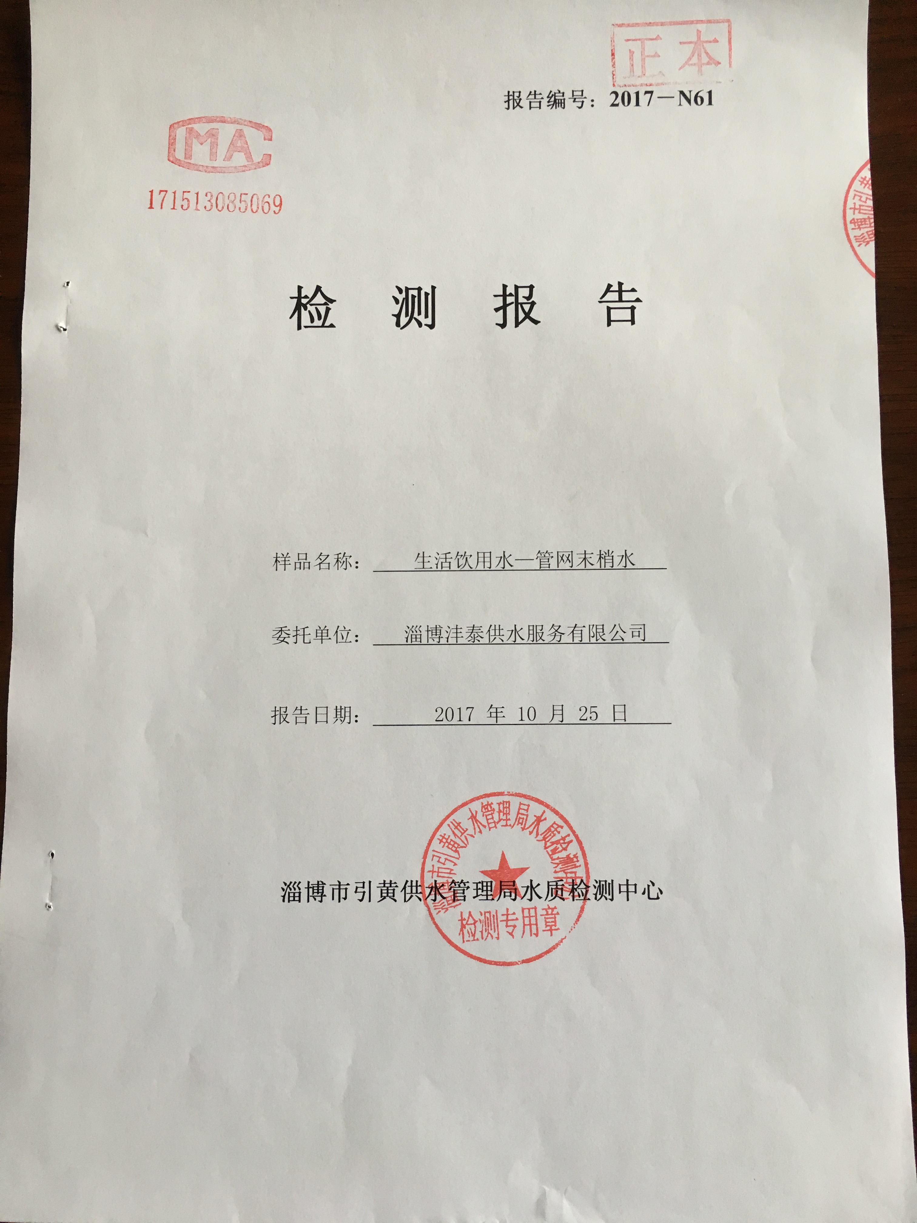 淄博灃泰供水服務有限公司管網水檢測月報表