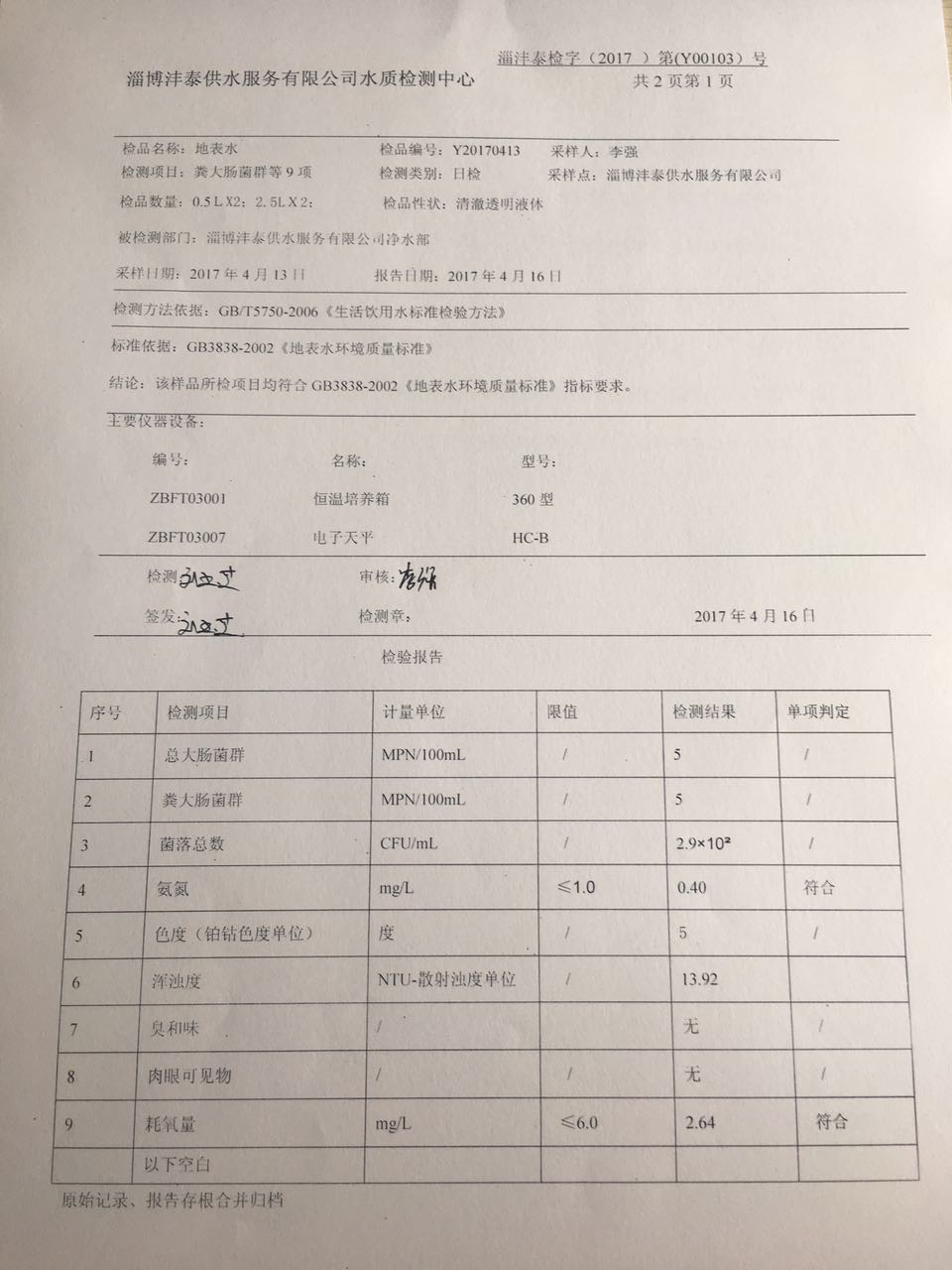 淄博灃泰供水服務有限公司地表水檢測日報表