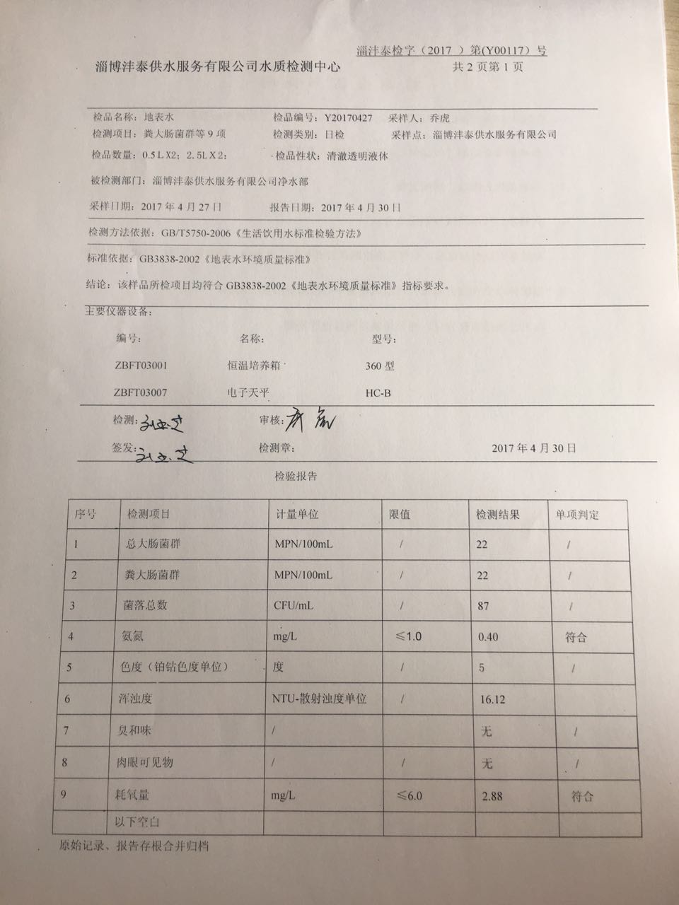 淄博灃泰供水服務有限公司地表水檢測日報表