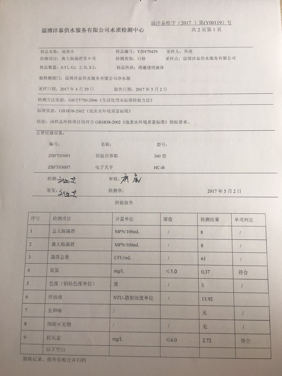淄博灃泰供水服務有限公司地表水檢測日報表