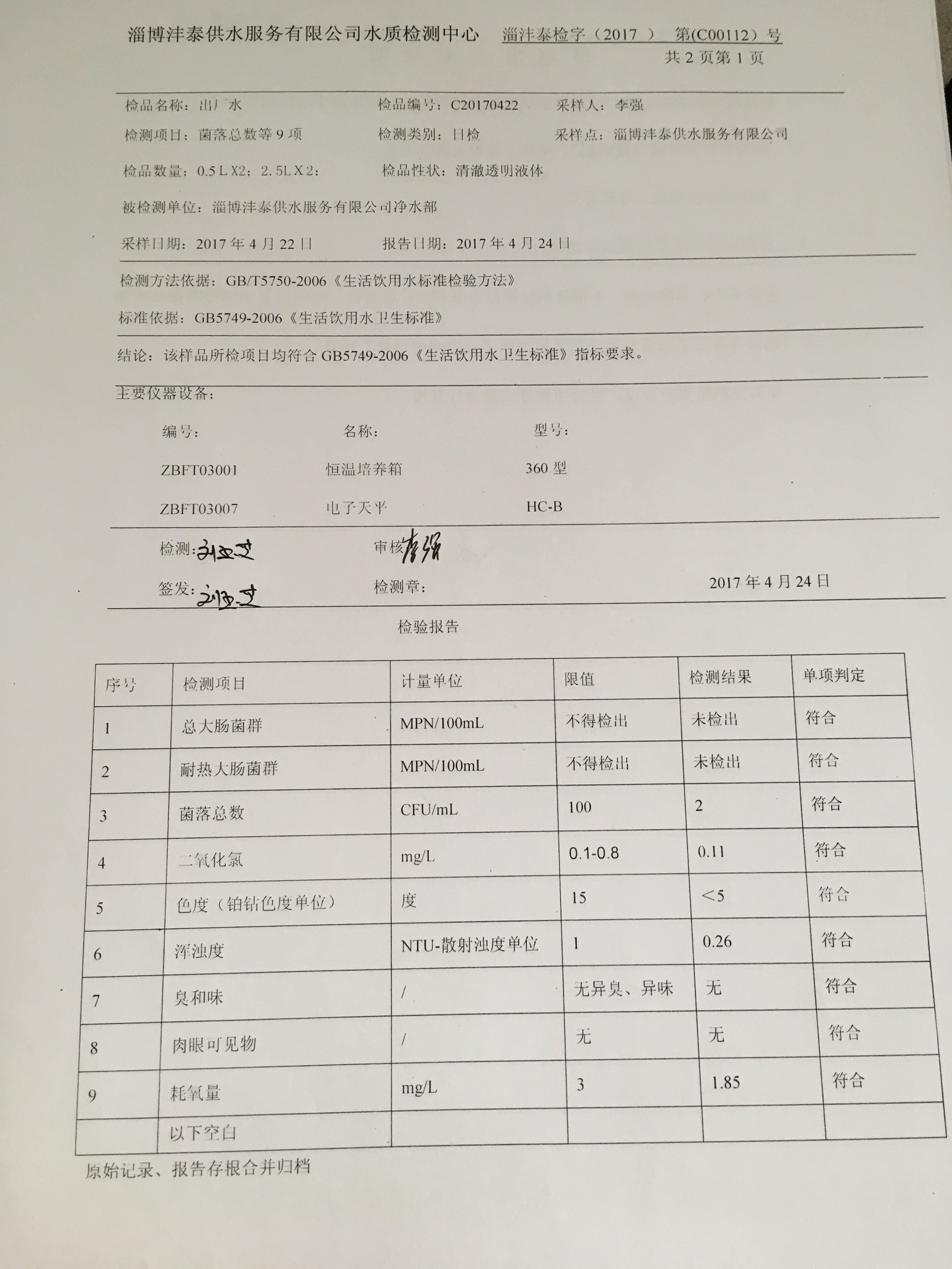 淄博灃泰供水服務有限公司水質檢測日報表