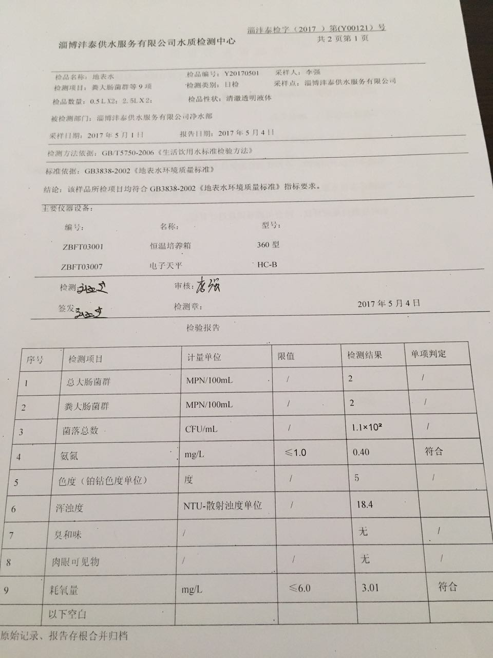 淄博灃泰供水服務有限公司地表水檢測日報表