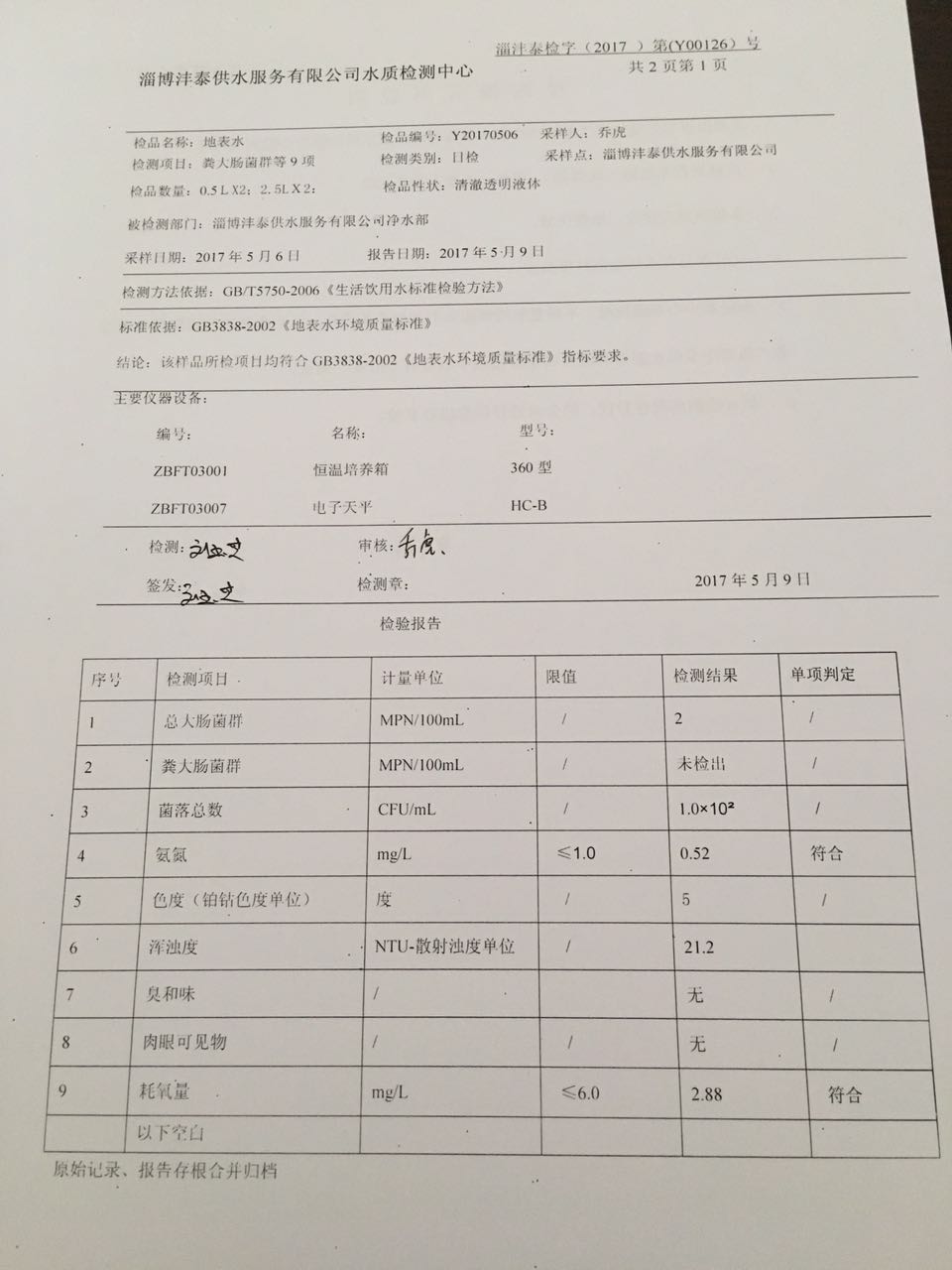 淄博灃泰供水服務有限公司地表水檢測日報表