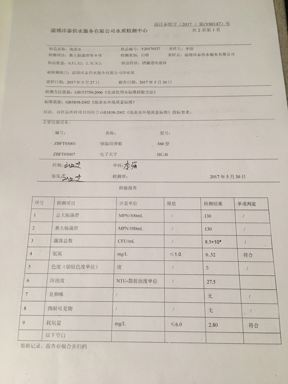 淄博灃泰供水服務有限公司地表水檢測日報表