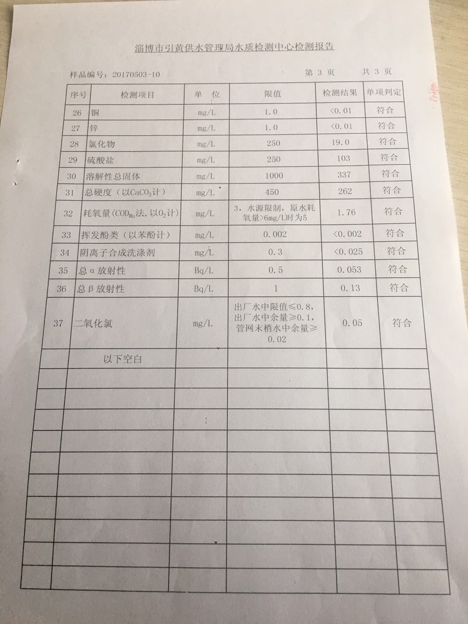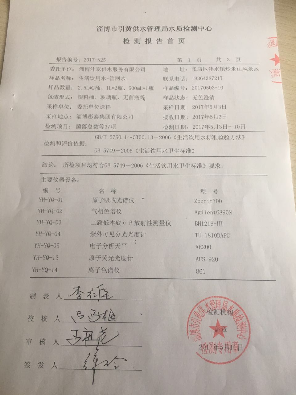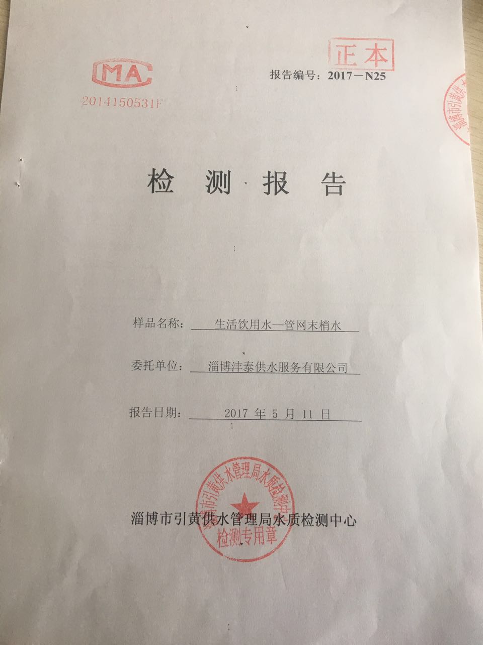 淄博灃泰供水服務有限公司生活飲用水管網水月檢報告