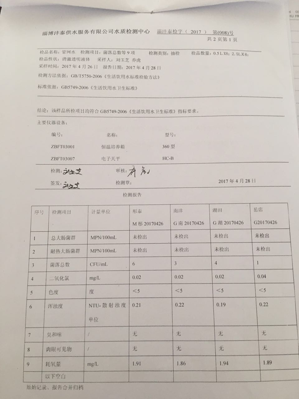 淄博灃泰供水服務有限公司管網水抽檢報告