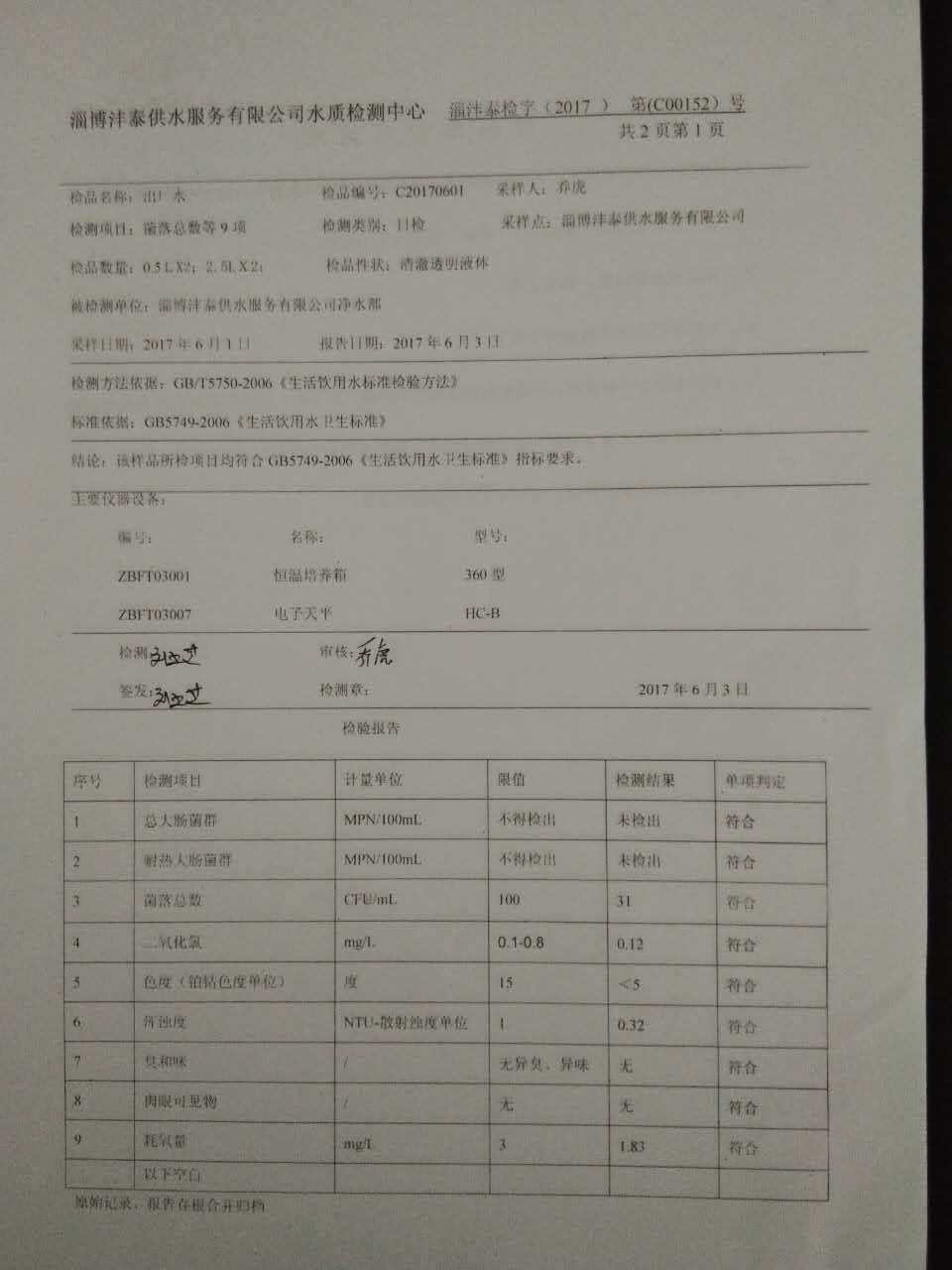 淄博灃泰供水服務有限公司水質檢測日報表