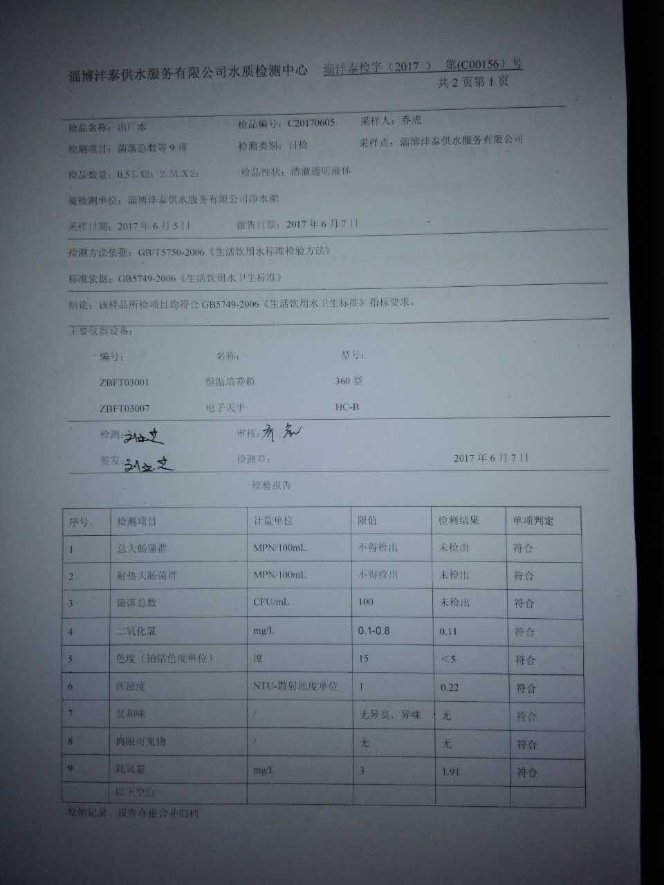 淄博灃泰供水服務有限公司水質檢測日報表