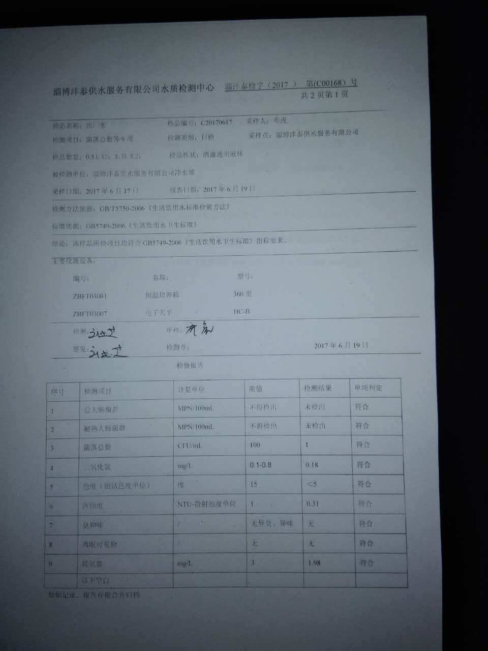 淄博灃泰供水服務有限公司水質檢測日報表