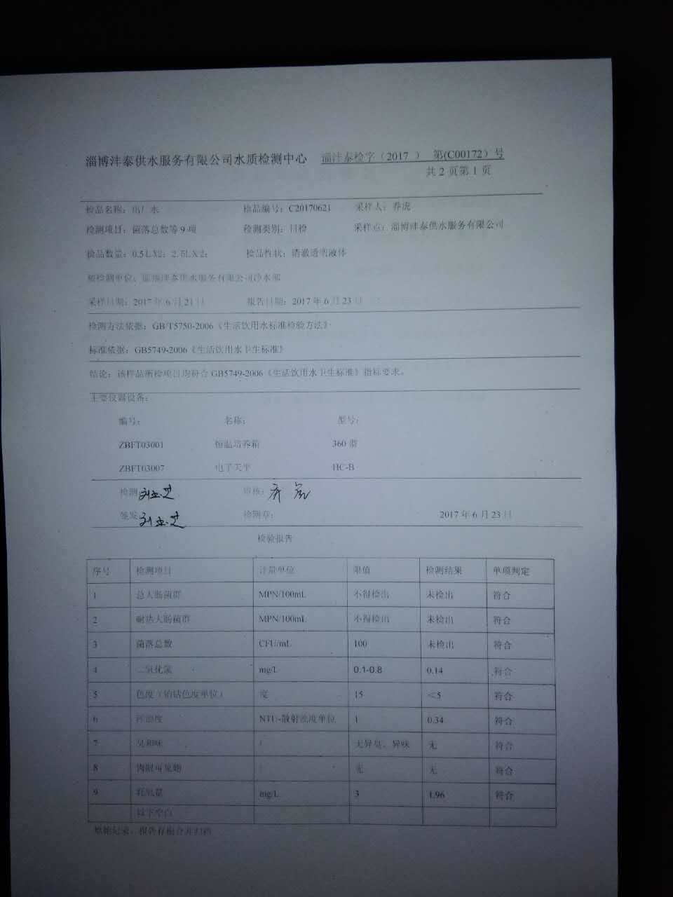 淄博灃泰供水服務有限公司水質檢測日報表