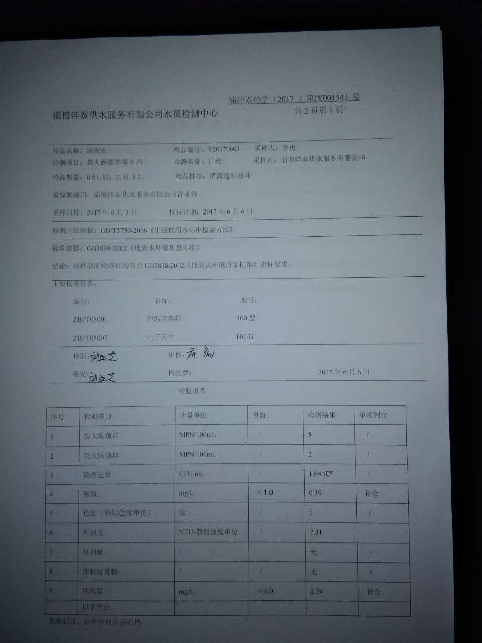 淄博灃泰供水服務有限公司地表水檢測日報表