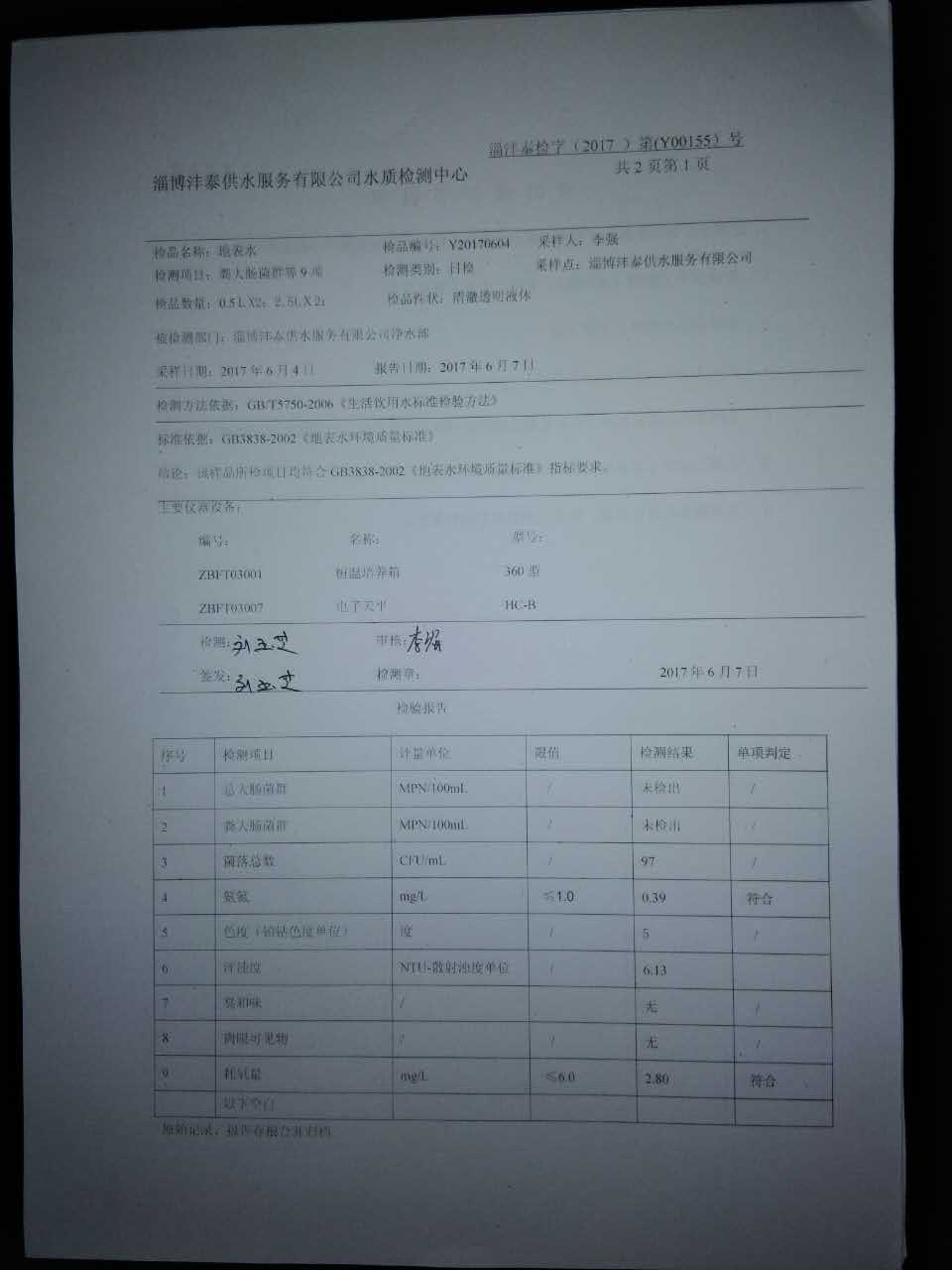 淄博灃泰供水服務有限公司地表水檢測日報表
