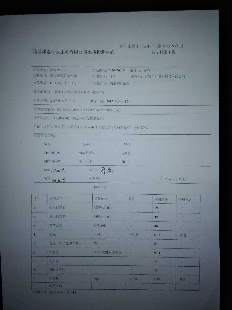 淄博灃泰供水服務有限公司地表水檢測日報表