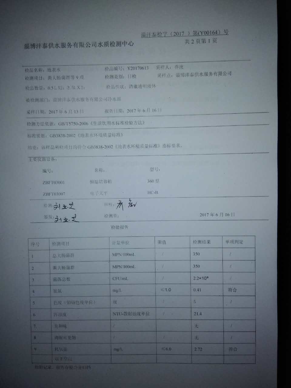 淄博灃泰供水服務有限公司地表水檢測日報表