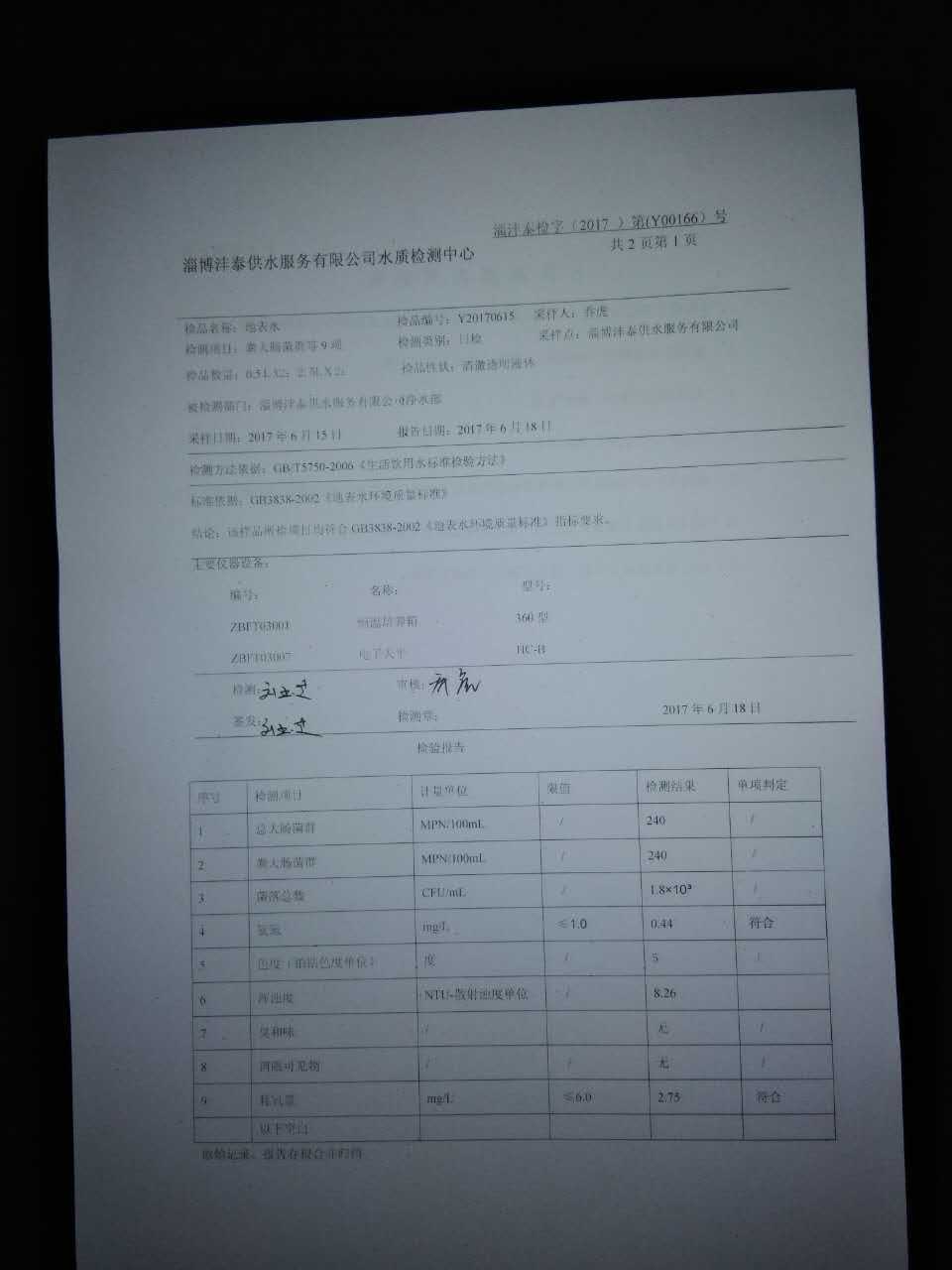 淄博灃泰供水服務有限公司地表水檢測日報表