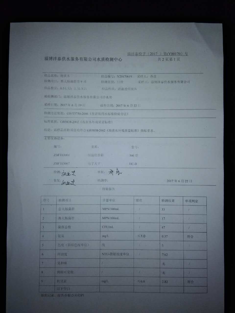 淄博灃泰供水服務有限公司地表水檢測日報表