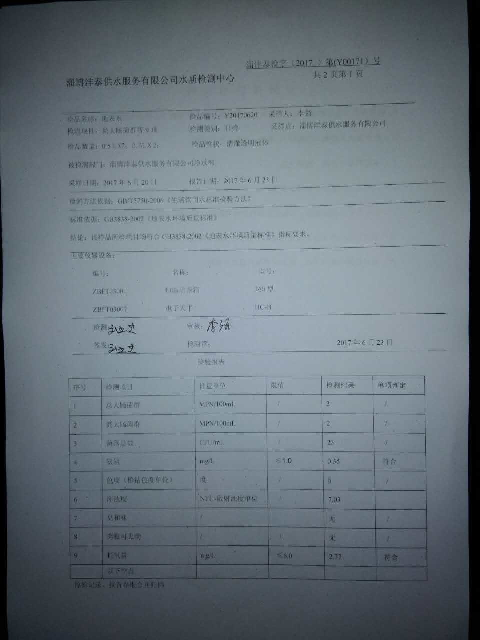 淄博灃泰供水服務有限公司地表水檢測日報表