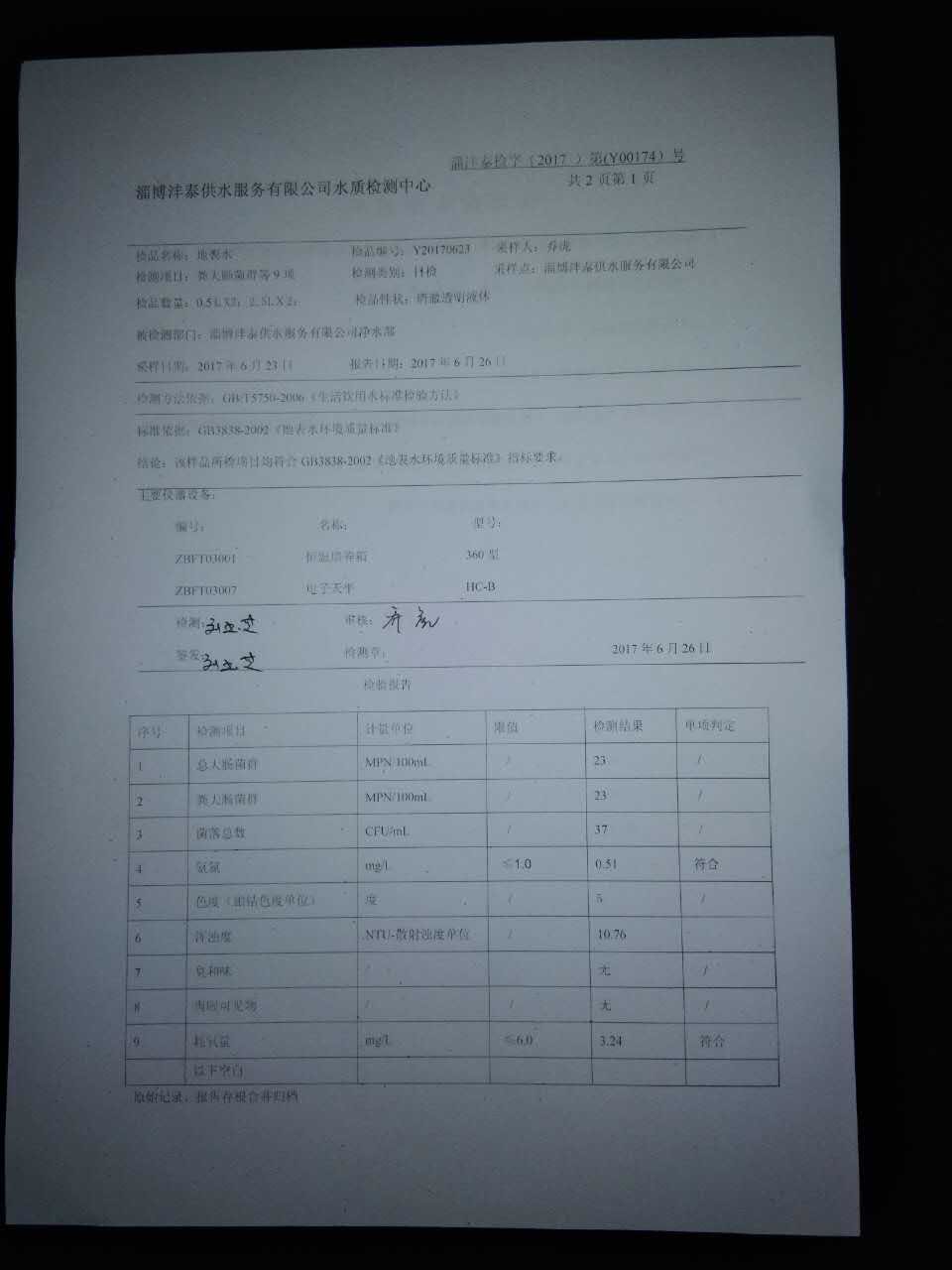 淄博灃泰供水服務有限公司地表水檢測日報表