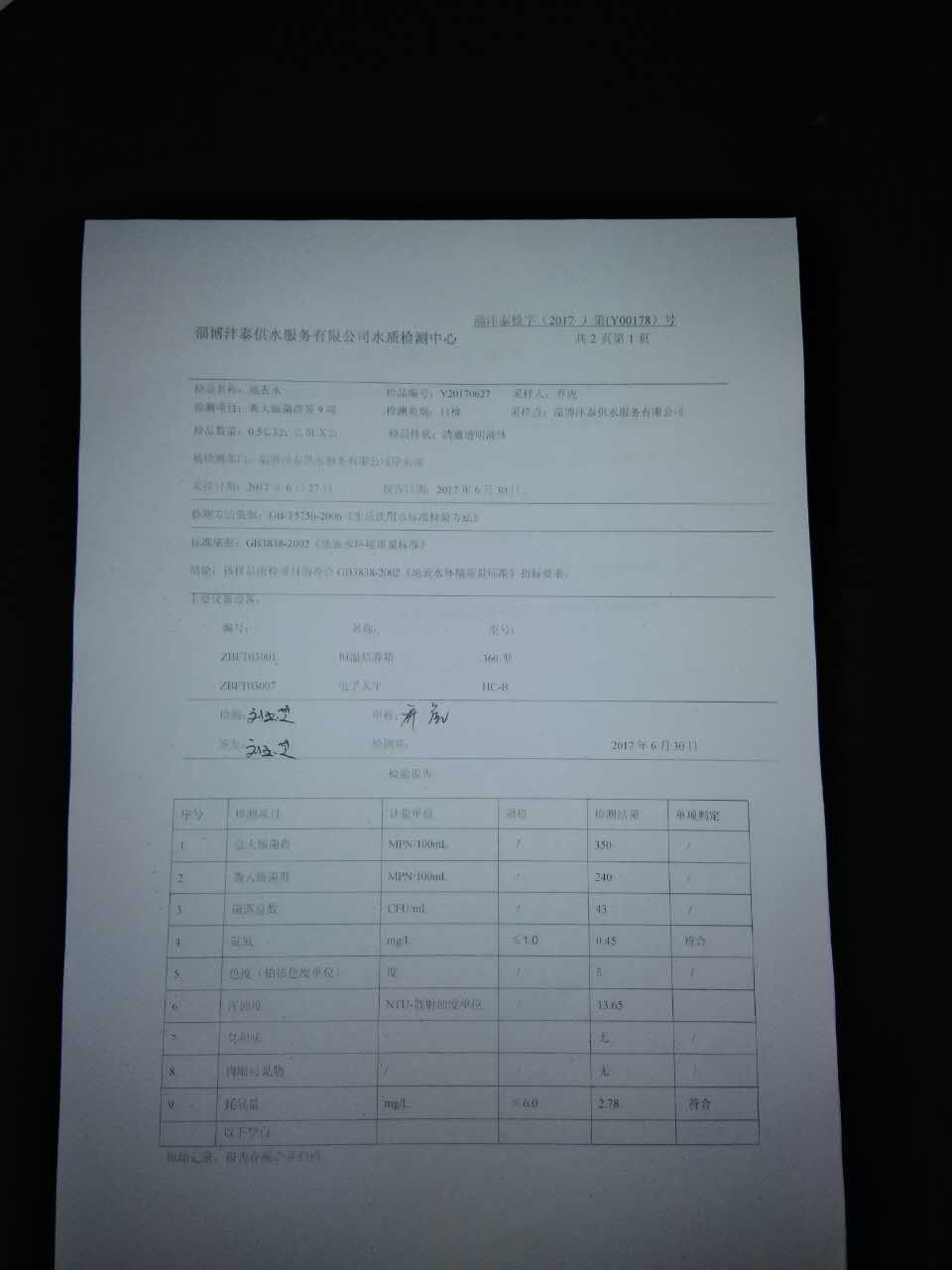 淄博灃泰供水服務有限公司地表水檢測日報表