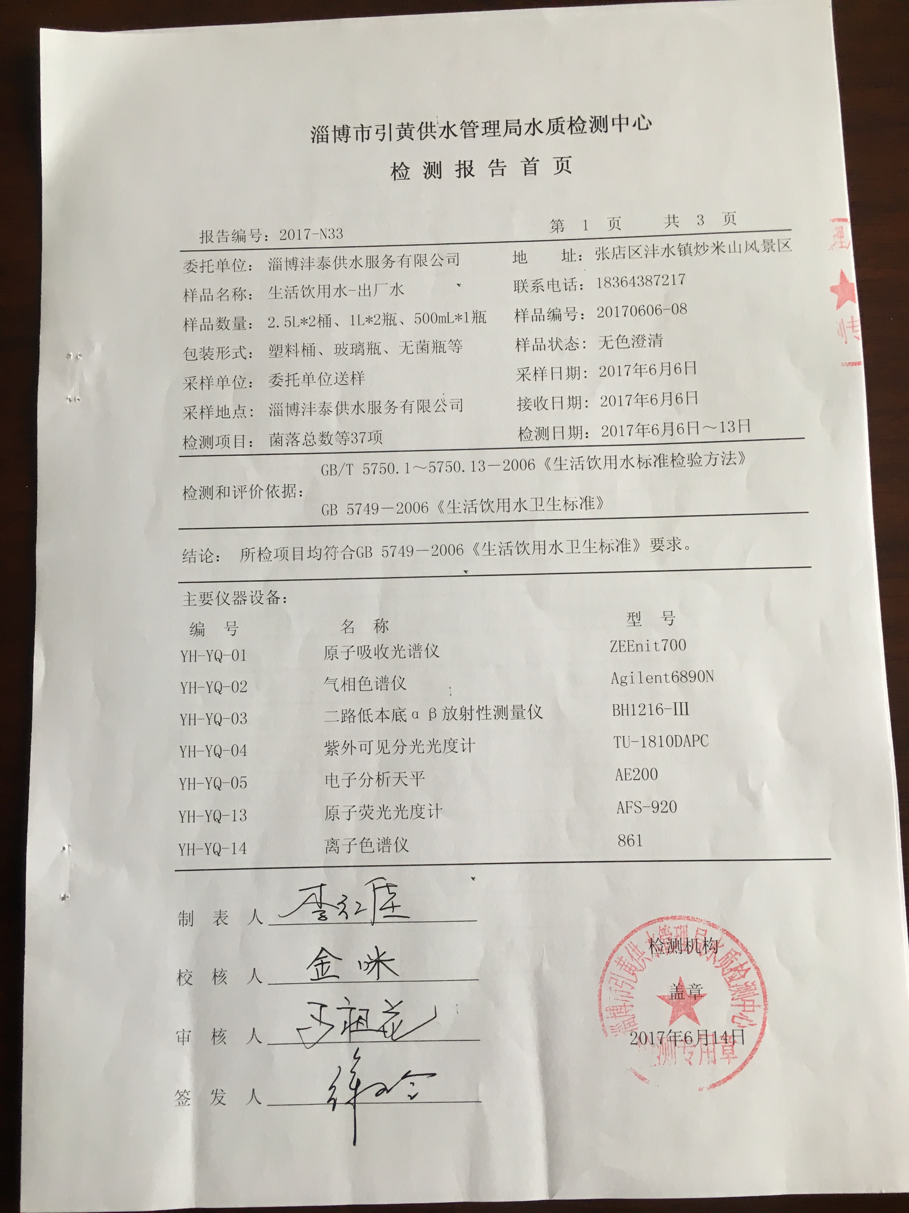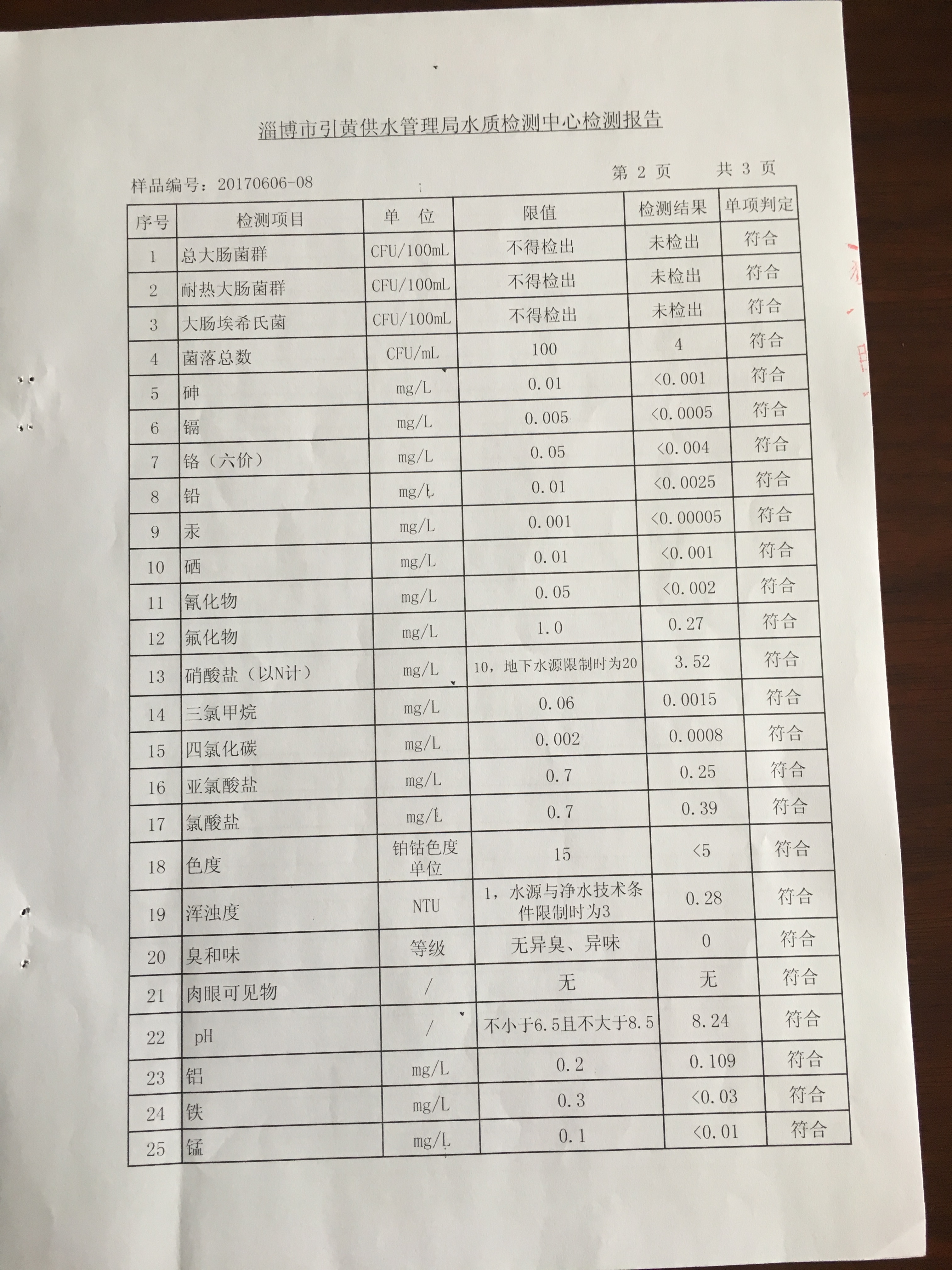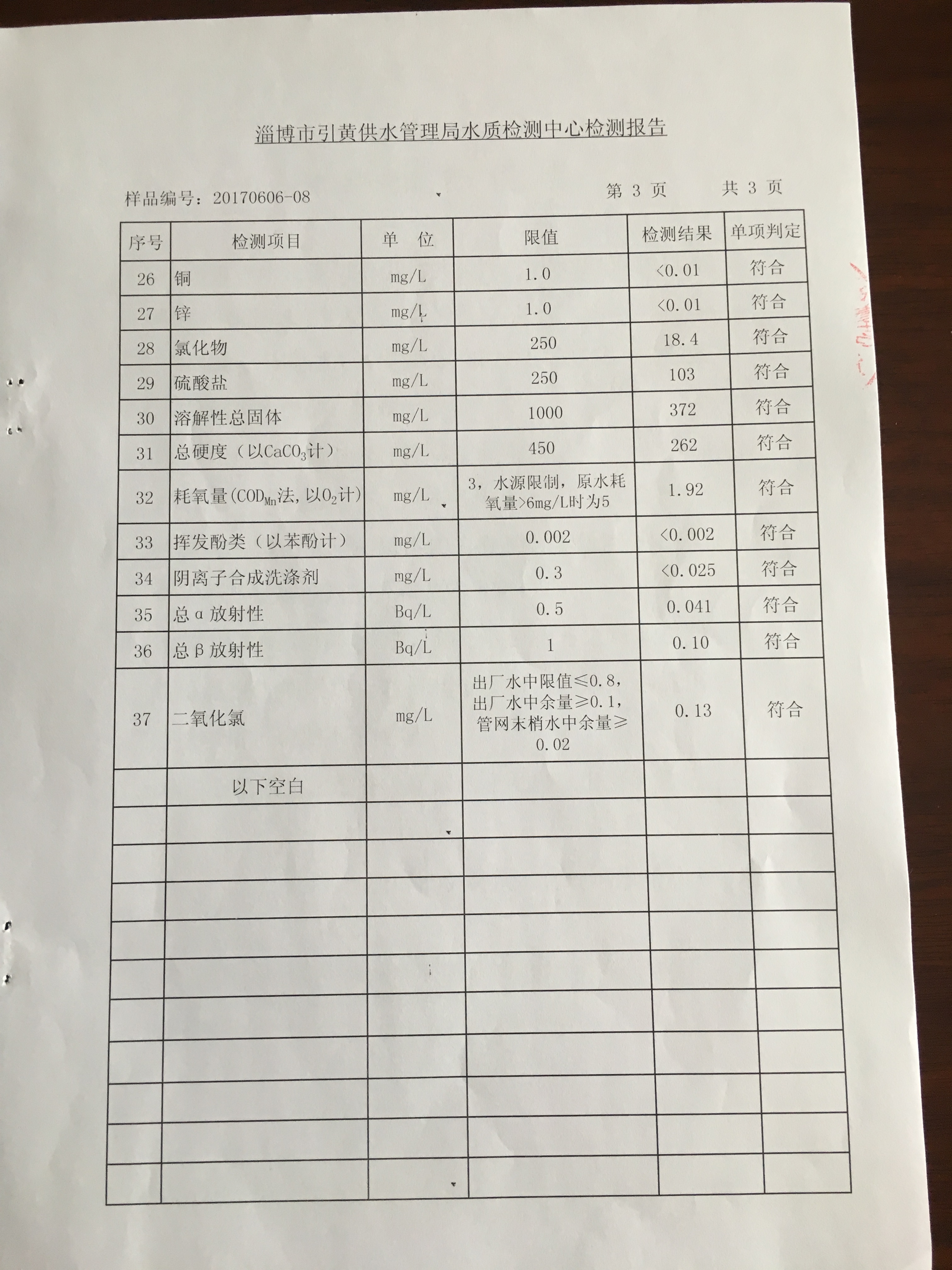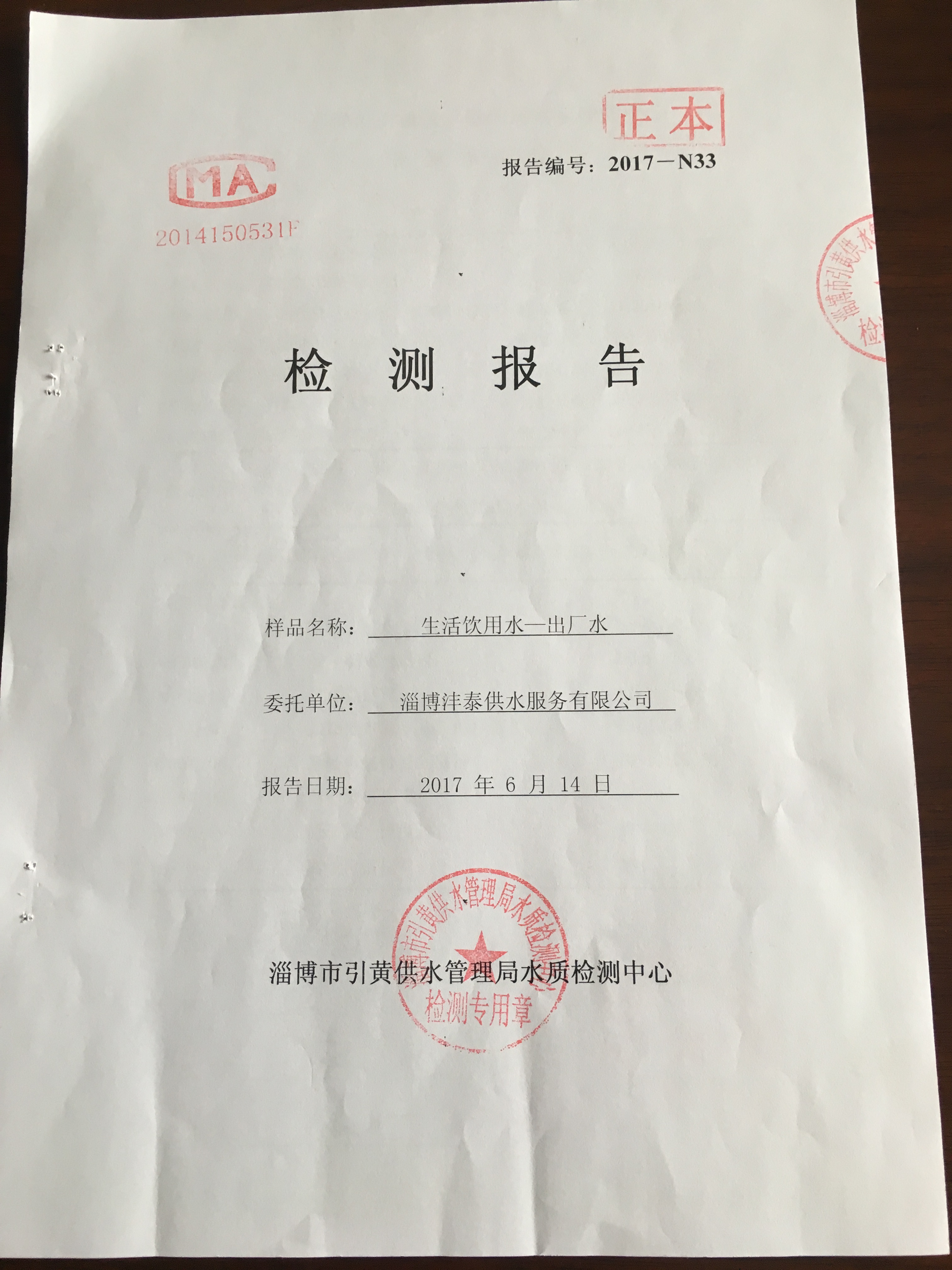 淄博灃泰供水服務有限公司出廠水檢測月報表