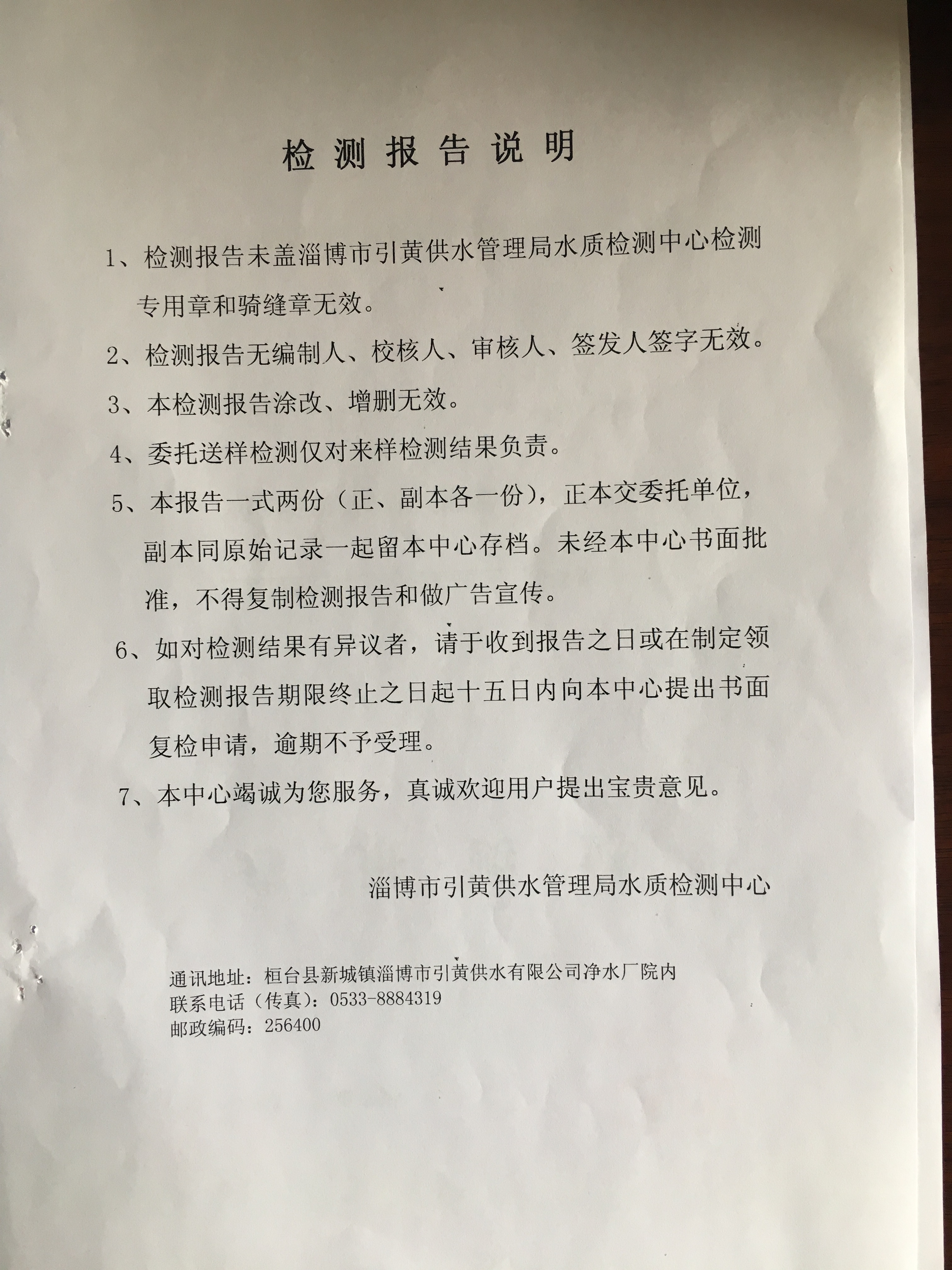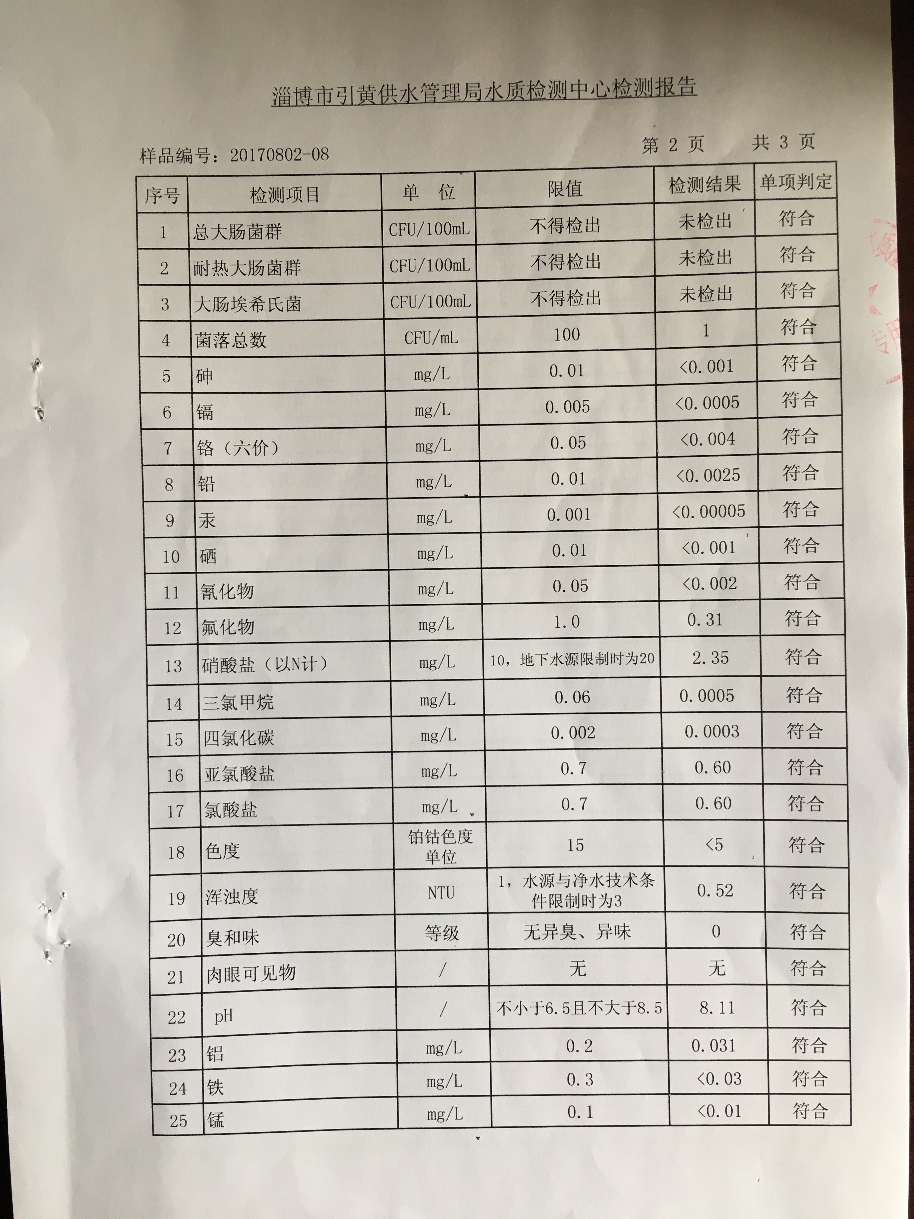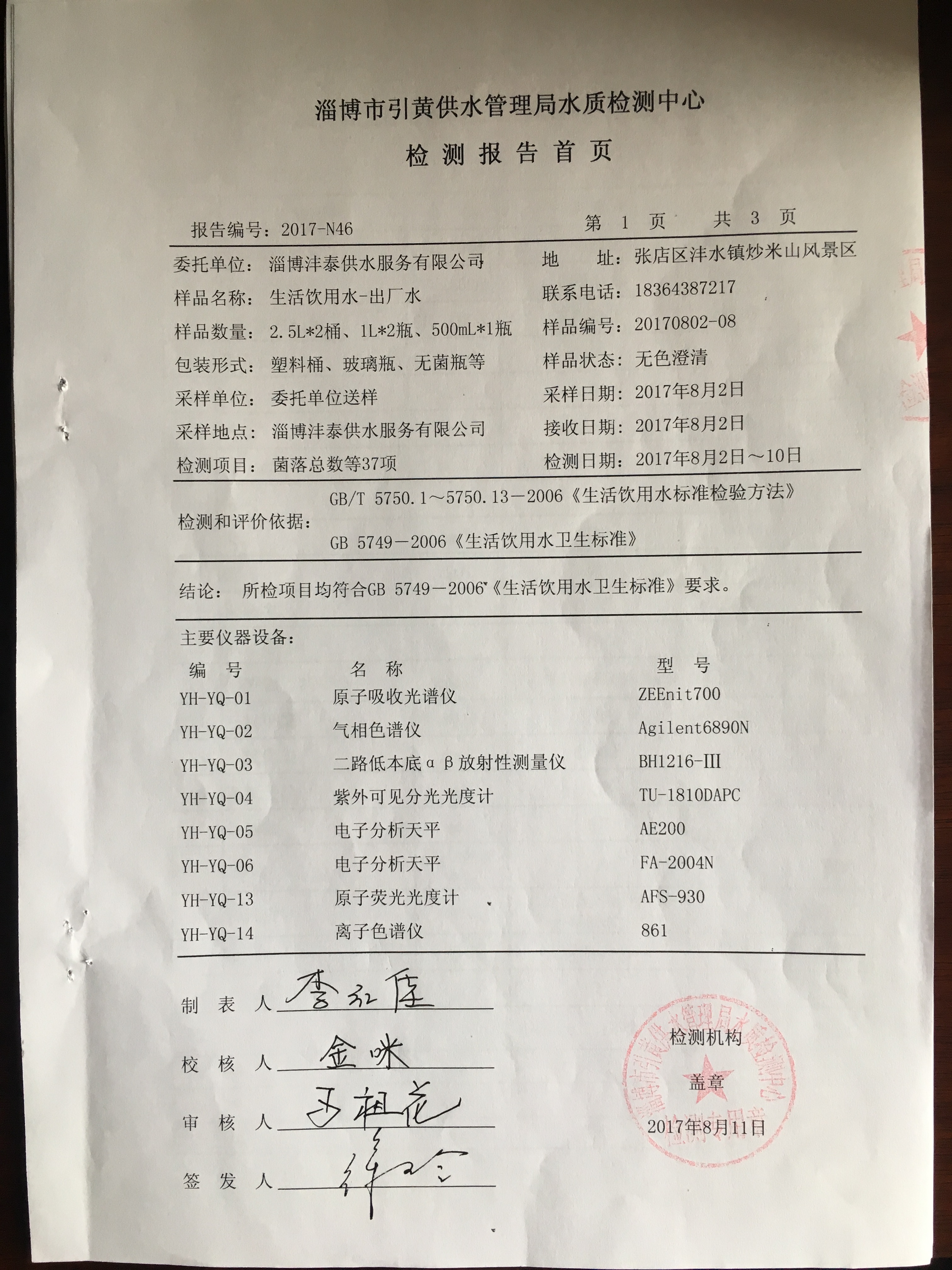 淄博灃泰供水服務有限公司出廠水檢測月報表