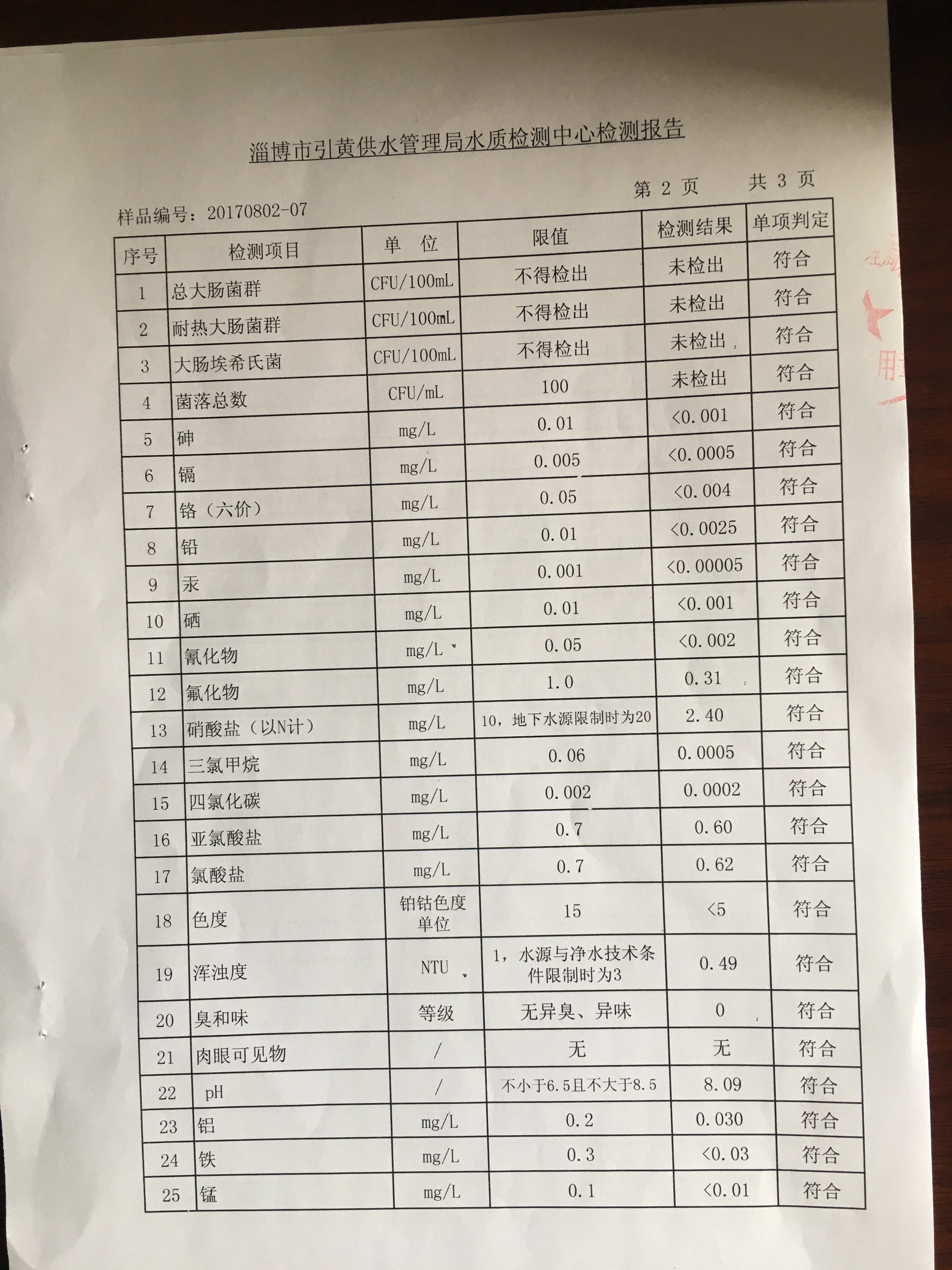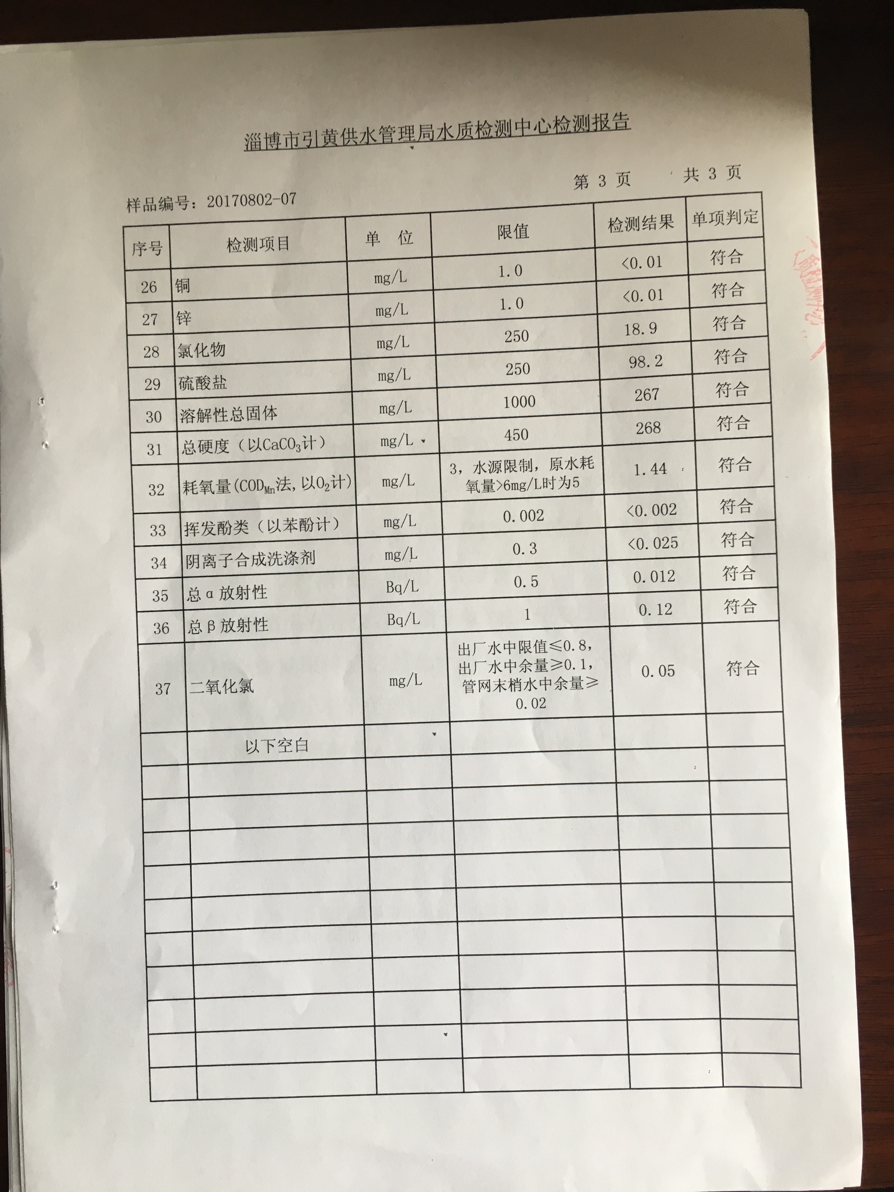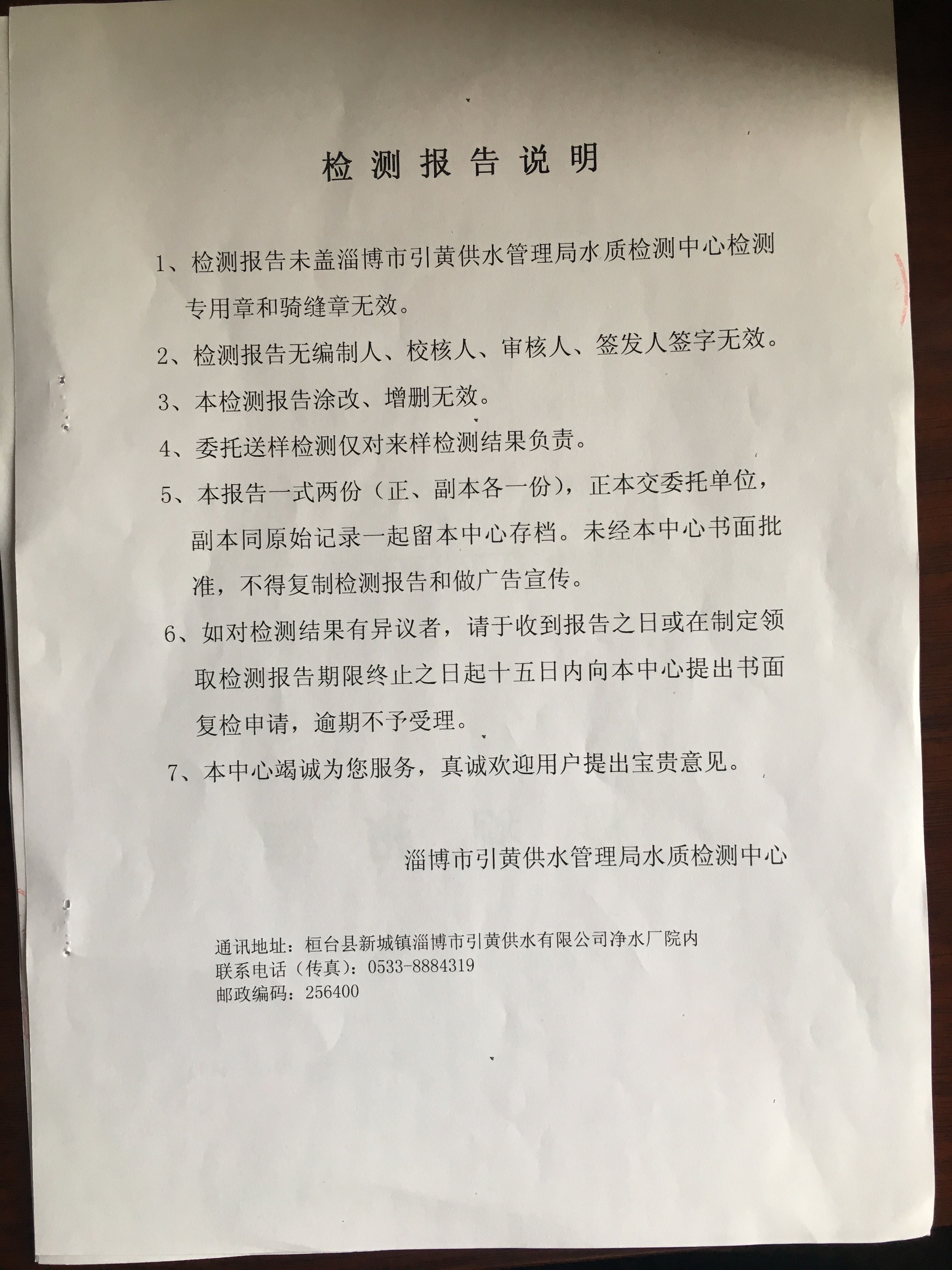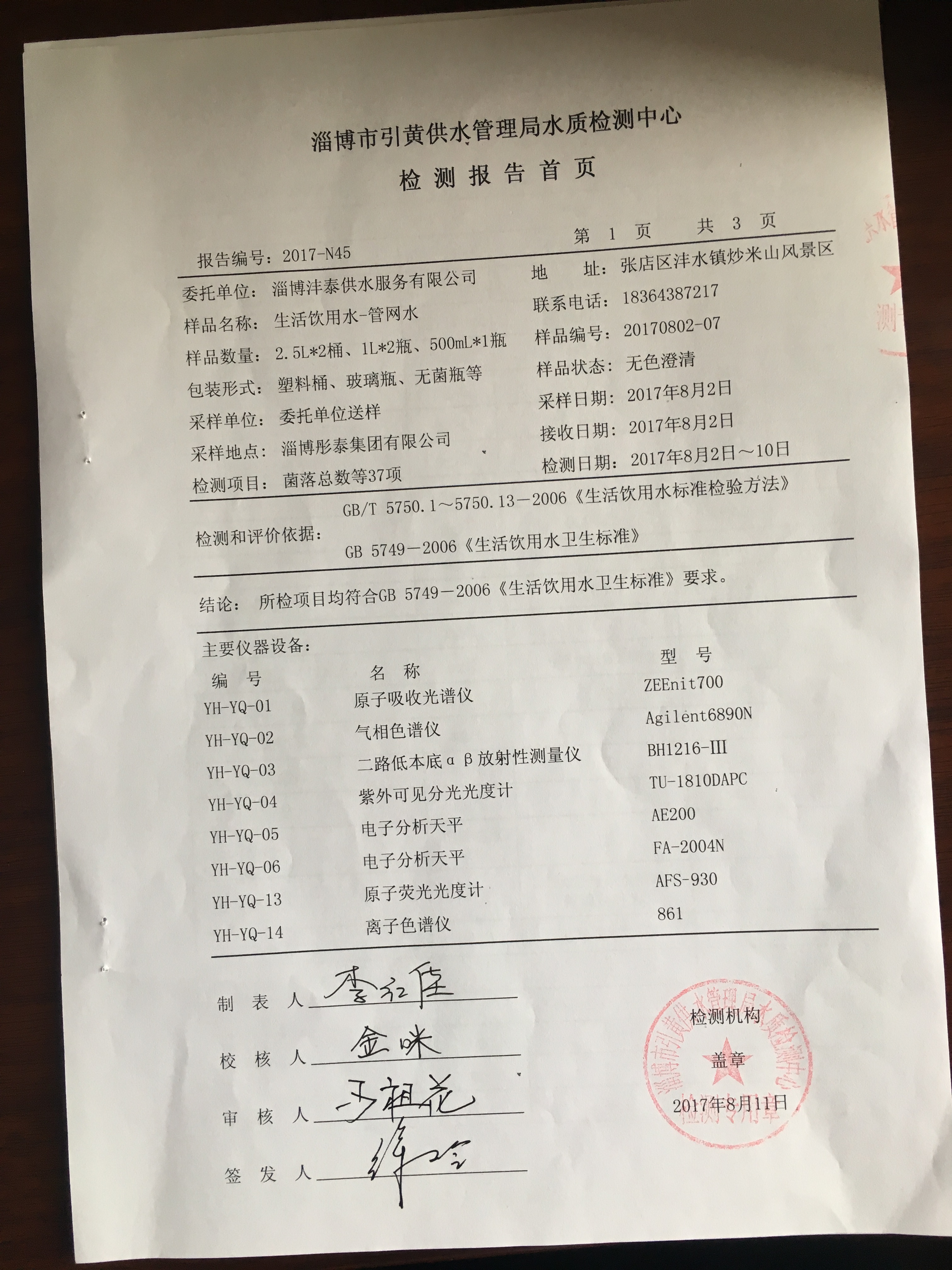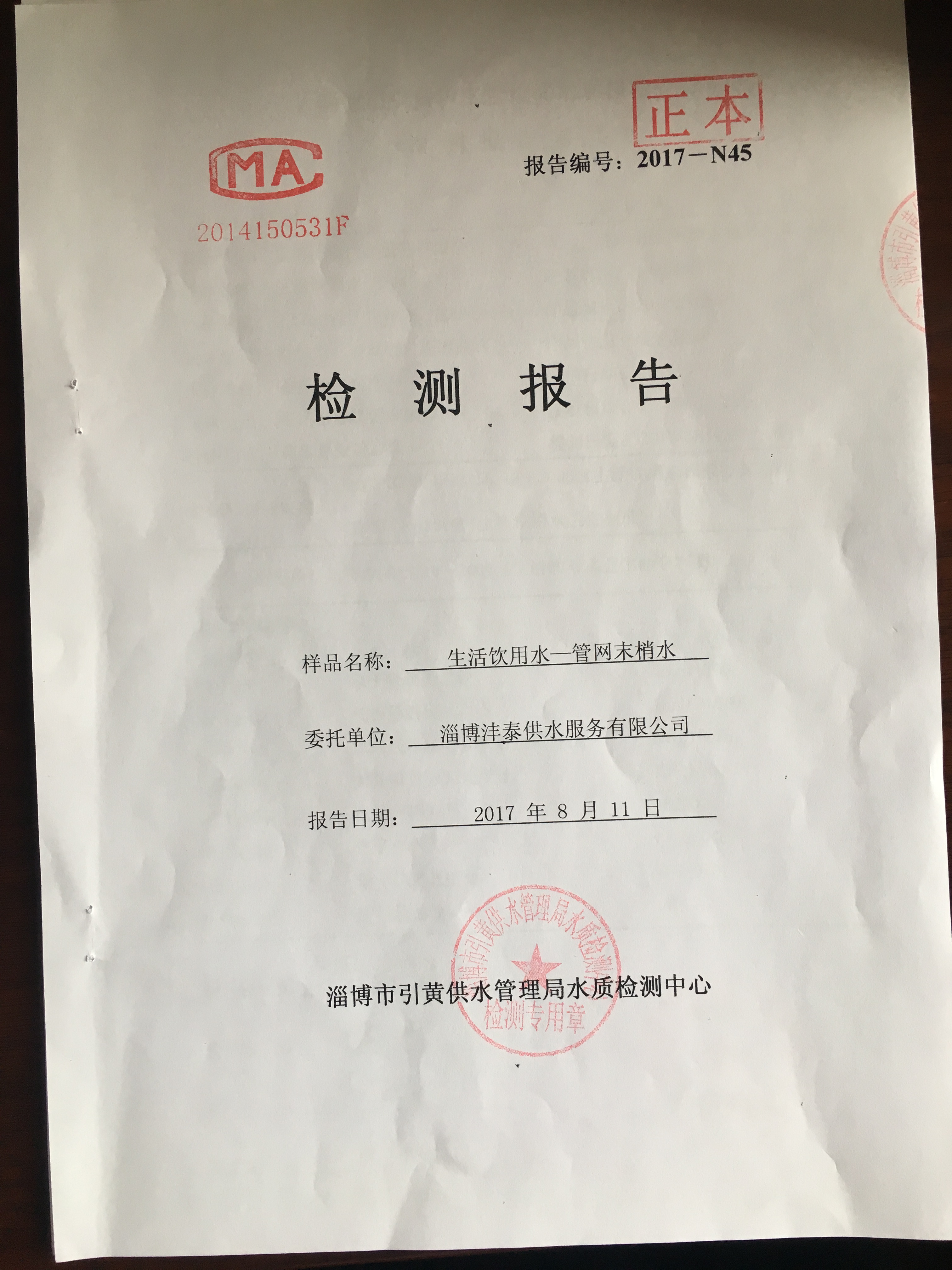 淄博灃泰供水服務有限公司管網水檢測月報表